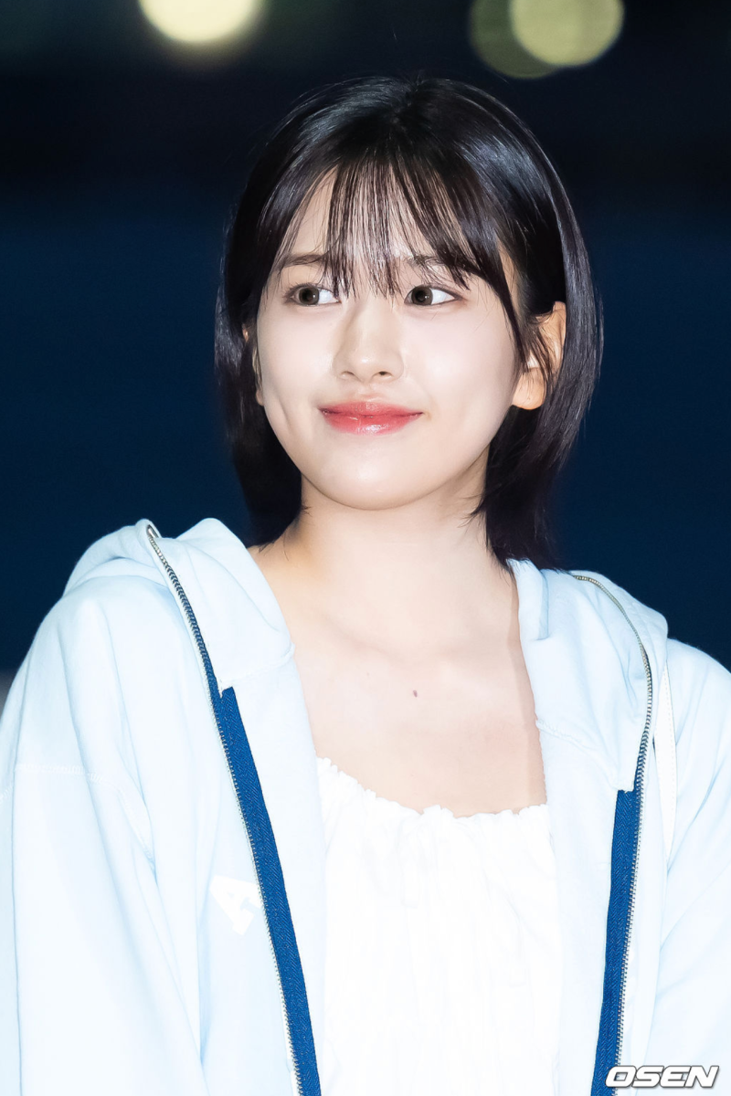 안유진의 머리는 층이 없는 곧은 밥컷이다.