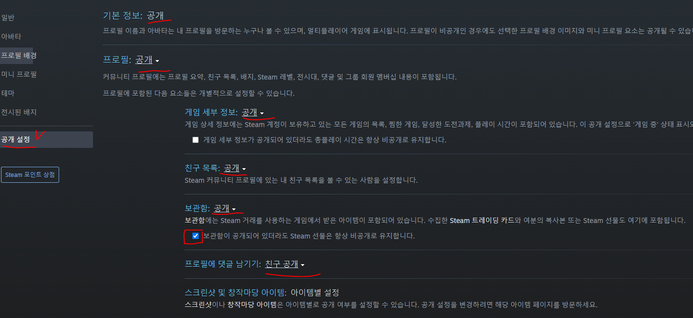 3. 공개 설정 클릭 – 해당 항목을 공개로 설정